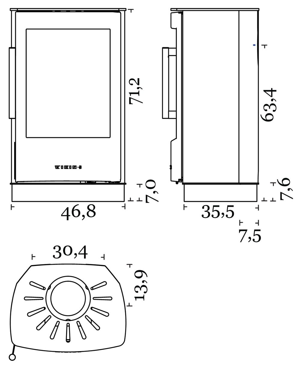Габариты. Печь не занимает много места, не требует большого пространства для установки. При этом Wiking Miro имеет огромное остекление. Для установки печи не нужен фундамент. Её можно устанавливать на любой тип полового покрытия. В том числе на деревянные полы или на ламинат. Нижняя часть Викинг Миро не нагревается СОВСЕМ. Для защиты от возможного попадания случайных угольков на пол мы укладываем перед печью небольшой стальной или стеклянный притопочный лист.