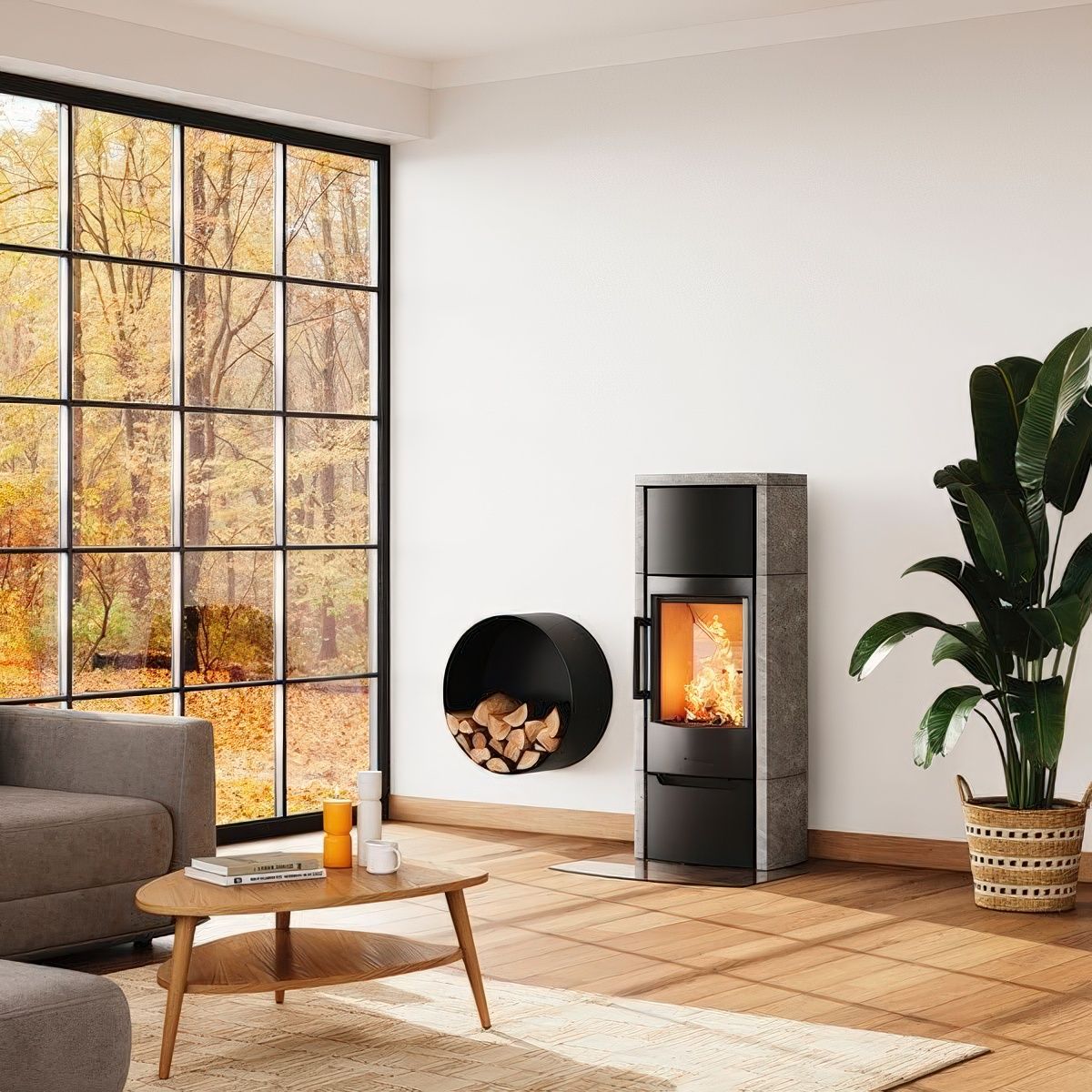 Качественная скандинавская печь с большим стеклом и умеренной мощностью.